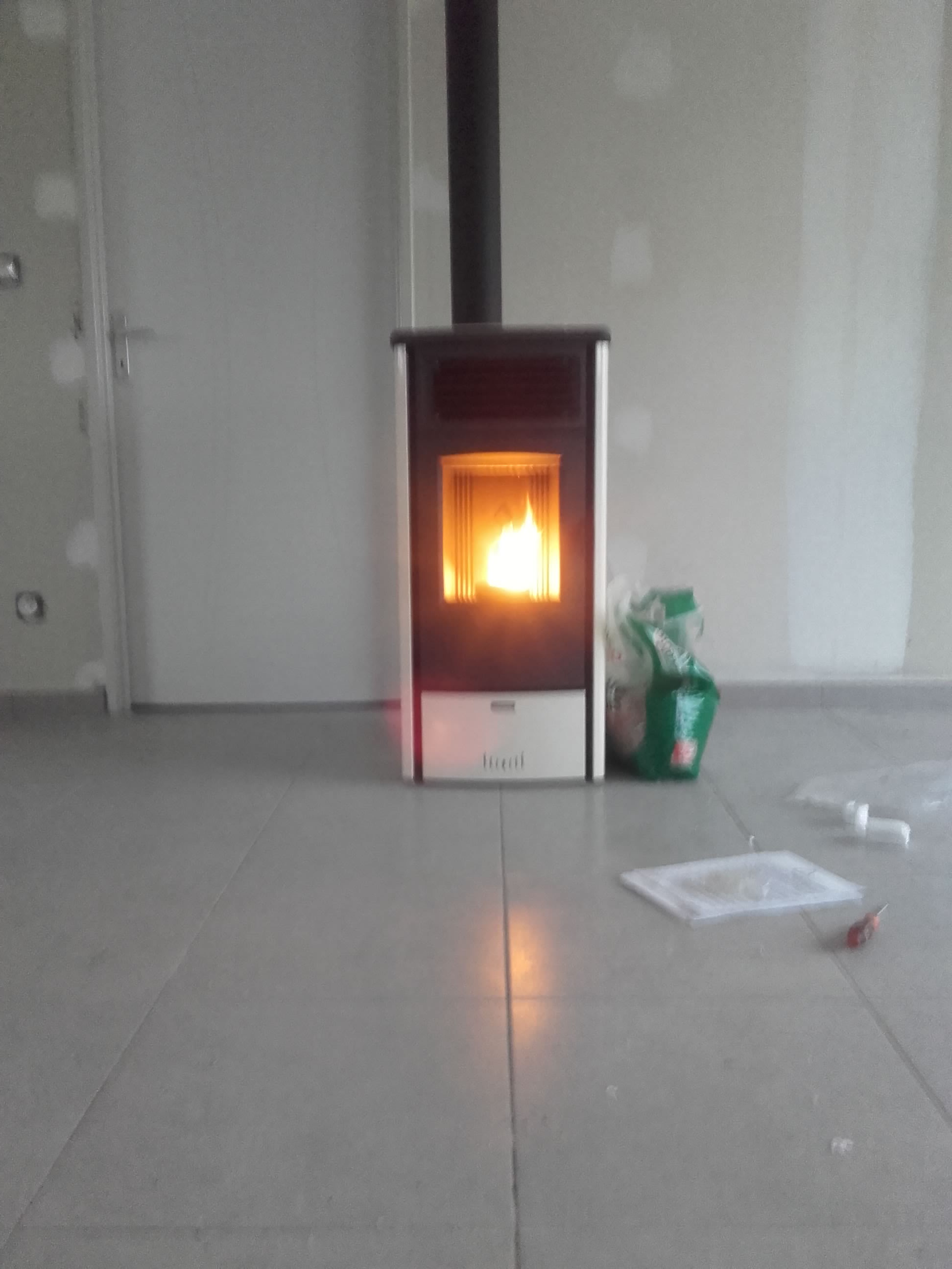 Installation d'un poêle à granulés les travaux avaient bien commencé mais les finitions pas terrible du tout petit trou en haut à gauche de la plaque au mur il aurait pu mettre du ciment réfractaire et l'extérieur il aurait pu mettre du mastic réfractaire
