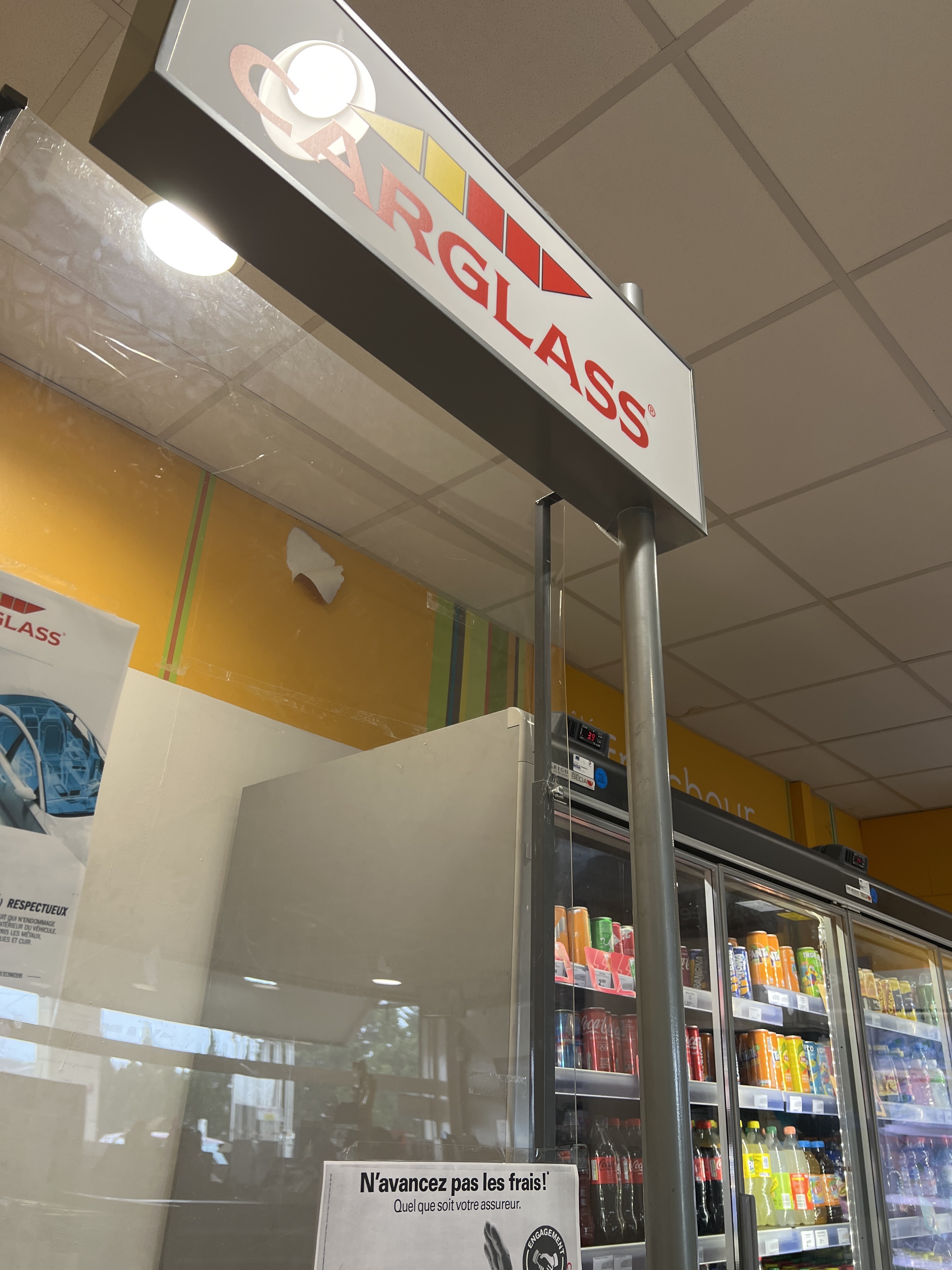 Accueil top Centre carglass situé à côté d’une station total : possibilité de rester au chaud + distributeur de boissons Prestation de qualité / remplacement vitre Je recommande fortement