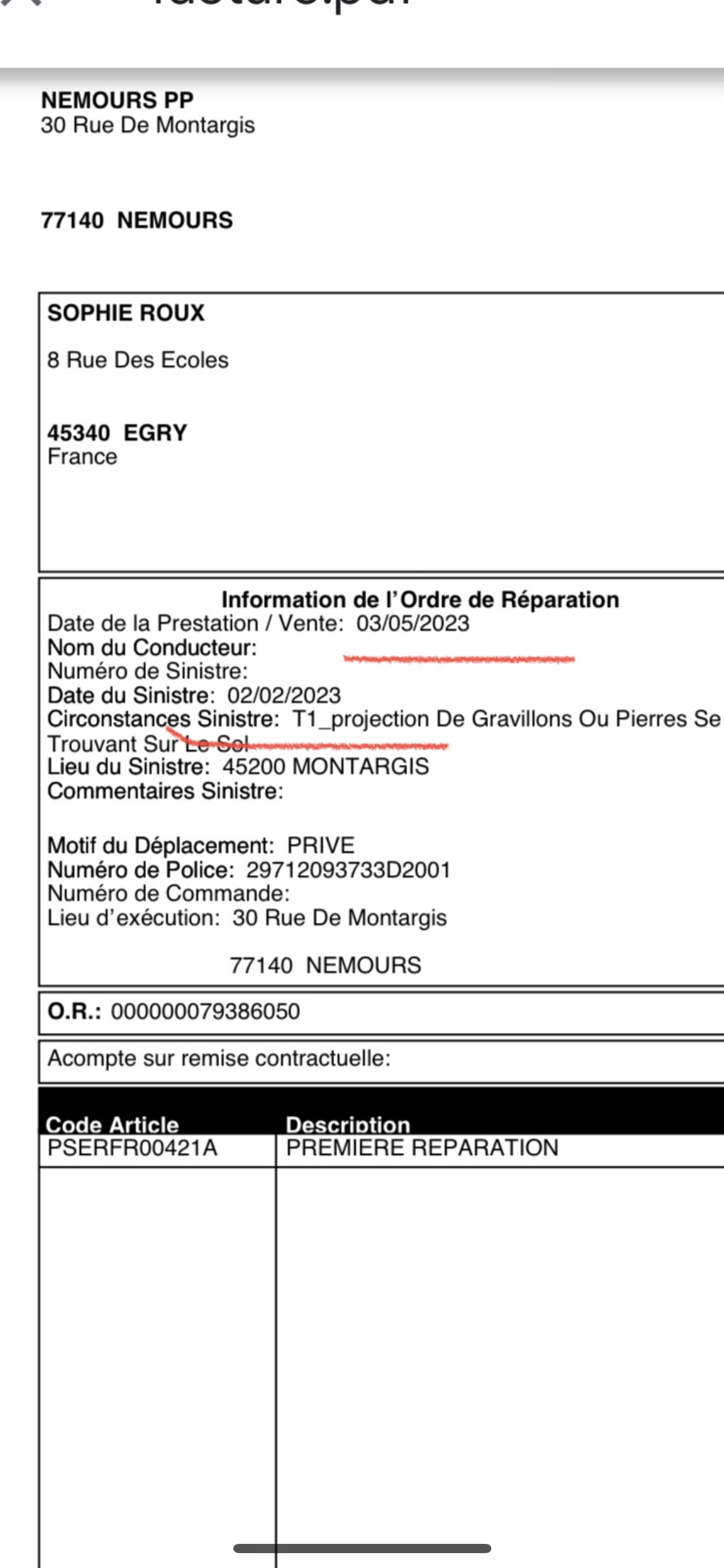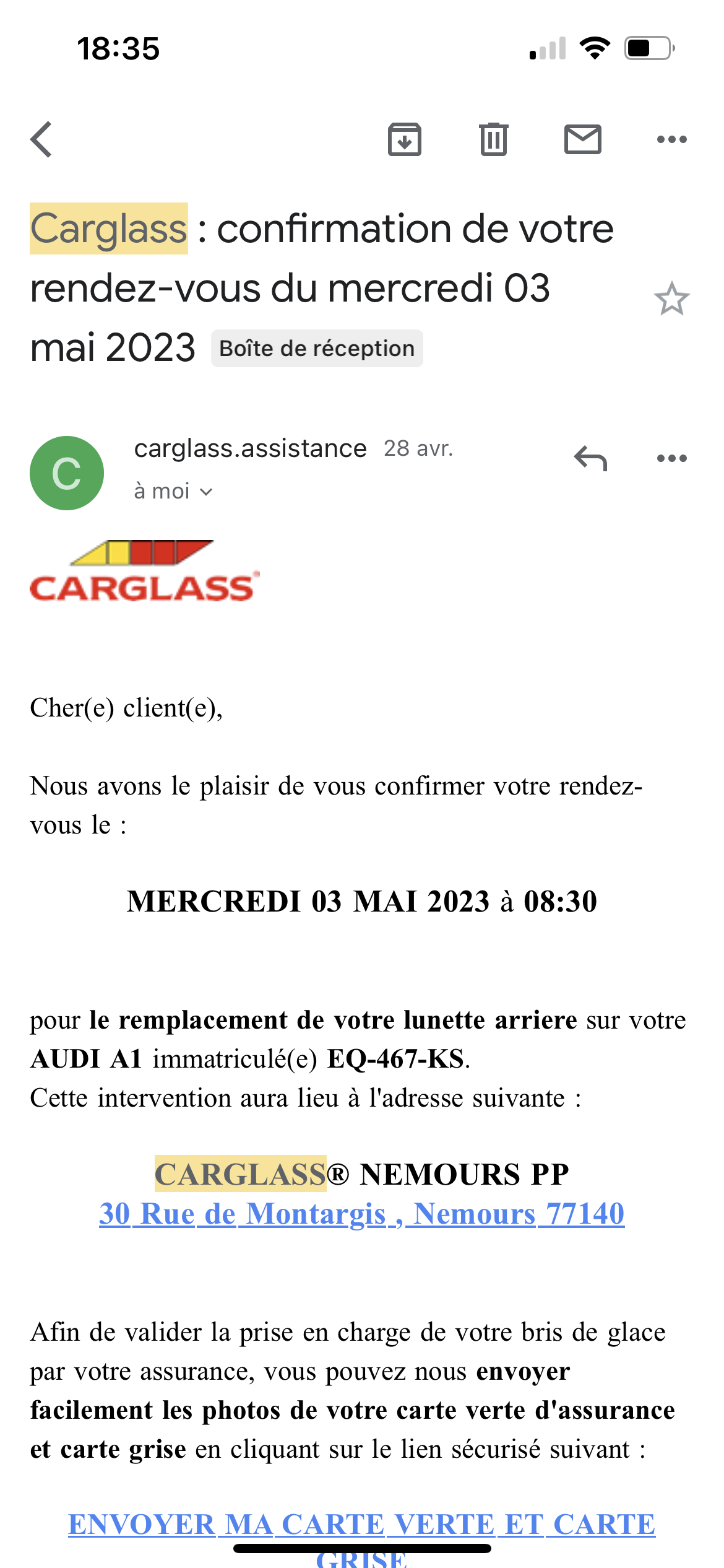 DES ESCROCS!! Faites attention à vos documents, date etc et ATTENTION même patron qu’a Montargis. Une plainte va être déposée!! Fin avril dernier, nous rentrons de vacances et pas de bol pour nous, une brique de notre cheminée est tombée sur mon pare-brise ARRIÈRE!! Nous prenons donc rdv au téléphone... Pas de disponibilités au Carglas de Pithiviers rapidement (qui est le plus prêt) nous nous retrouvons donc à devoir aller à Nemours! Plus loin mais bon, avec une petite fille a aller chercher à l’école tous les jours et un conjoint en déplacement souvent, l’organisation est au millimètre chez nous!! En fonction de nos disponibilités ce jour là, c’est mon conjoint qui emmène ma voiture à Nemours. Le 3/05 donc pendant qu’il est là bas je reçois deux mails…celui de mon rdv initial de 8h30 et un mail de prise en charge de mon véhicule pour un 2ème rdv alors que j’en avais qu’un seul « normalement »… Je demande donc à mon conjoint pourquoi…Il me répond que c’est normal parce que le monsieur de chez Carglas lui a proposé gentiment de réparer un impact sur mon pare-brise AVANT en plus des travaux a faire sur l’arrière… Mon conjoint demande donc si cela va me couter qqchose ou changer un truc sur mon assurance « non non rien du tout » dixit l’escroc… Donc sans demander, le mec a fait! Les mois passent, j’ai ma voiture depuis bientôt 3 ans, je sais exactement le nombre de « sinistre » que j’ai eu…deux avec ce pare-brise, le premier c’est un … qui m’a arraché mon retro mais…il a eu l’honnêteté de s’arrêter!! Nous décidons de changer d’assurance!! Je demande donc à mon assurance mon relevé d’informations et là…une merveilleuse surprise m’attend!! Trois sinistres!!! Ah bon? Deux concernant des pare-brise…ah bon? Donc celui signalé a mon assurance fin avril et un qui sort de nulle part « le 2/02/2023 » à Montargis…projection de cailloux en provenance du sol… Alors non seulement c’est FAUX, ils ont fait une FAUSSE SIGNATURE sur le document qu’ils ont envoyé à l’assurance (personne ne signe comme ca en 2023 voir la photo…) Non seulement ils n’ont pas respecté les conditions générales de vente de LEUR ENTREPRISE mais en plus de ça ils mettent le client dans la m….. mais alors sans aucun scrupule!!! Bien sur, on a essayé de les appeler… « j’imprime le dossier je vois avec mon responsable et je vous rappelle!! » naturellement personne ne m’a rappelé!! Sans compter que je n’ai pas fait de scandal car sous le plancher de mon coffre il y’a encore 1 millions de bout de verre que vous deviez aspirer…Alors dans tout ça vous avez facturez 115€ à mon assureur pour faire grossir votre CA, deja que vous quémandez des avis positifs…ça vous suffit pas??! Comment se fait-il que mon conjoint n’ai pas signé votre daube de document? Puisqu’il a signé l’autre?! Je ne vais naturellement pas laissé ça là…Puisque je suis pénalisée pour mon assurance a cause de VOUS!!!! Faux, usage de faux, fausse déclaration de sinistre, fausse signature!!